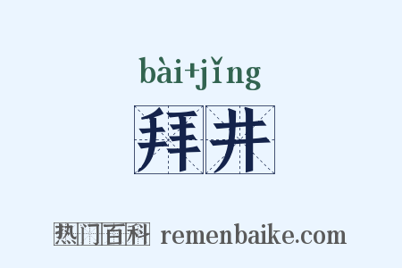 注音: ㄅㄞˋ ㄐㄧㄥˇ释义汉耿恭行军时缺水,拜井而得水。后遂用以为典实。同源典故佩刀刺山 刺山 广利开泉 泄井 甘泉涌 疏勒乏水源 疏勒出飞泉 耿恭拜井 耿恭祷泉